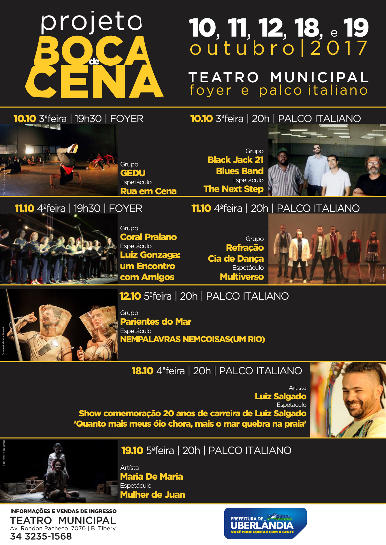 O Projeto Boca de Cena acontece nos meses de Outubro e Novembro no Teatro Municipal de Uberlândia, objetivando o fomento às Artes cênicas e Musicais,